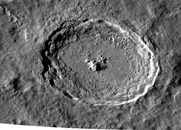 Relative ages of craters can also be determined by looking to see what crater is on top of another crater. The craters on top are younger, the older crater on the bottom. At least three layers of craters can be seen in the craters at the center of this image.